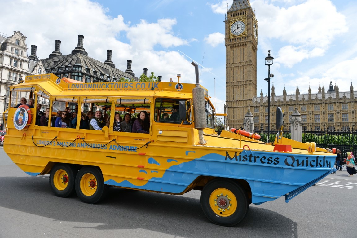 The boat was operated by London Duck Tours and is an amphibious wartime troop carrier called a DUKW - commonly known as a duck - which were used in large numbers for the Normandy D-Day landings. They are used around the world for marine tourism operations, this one being painted bright yellow.